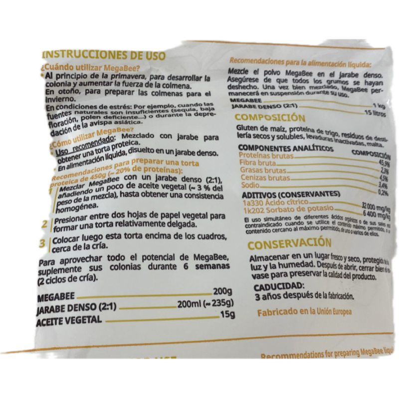 Todos los ingredientes que contiene MegaBee son no transgénicos (NO OMG) y están fabricados en Europa, al igual que MegaBee. Como fuente de proteína, no incluye harina de soja, ya que este cereal puede contener los azúcares estaquiosa y rafinosa, que son tóxicos para las abejas, y factores antinutricionales (principalmente el factor inhibidor de tripsina) que afectan a la habilidad de las abejas para digerir las proteínas.3